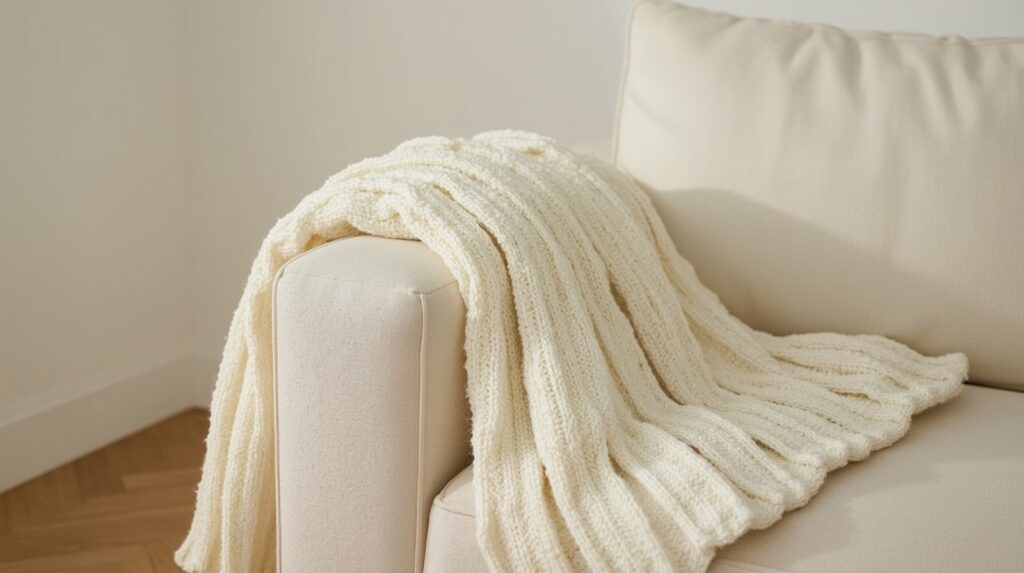 A throw blanket isn’t decorative if it’s hidden. Draped over the arm of a sofa or loosely folded on a chair, this cream chenille knit adds the kind of texture that makes a room feel genuinely cozy rather than staged.